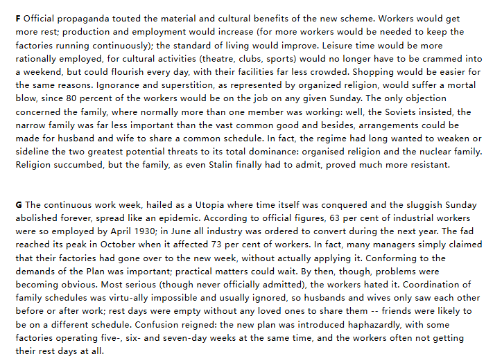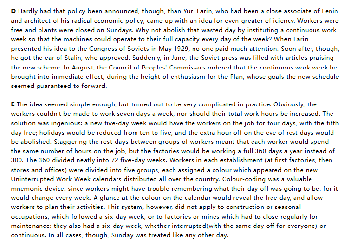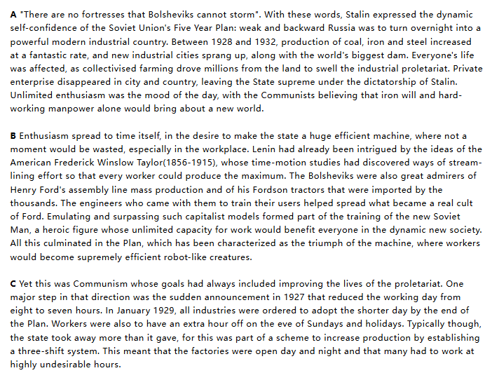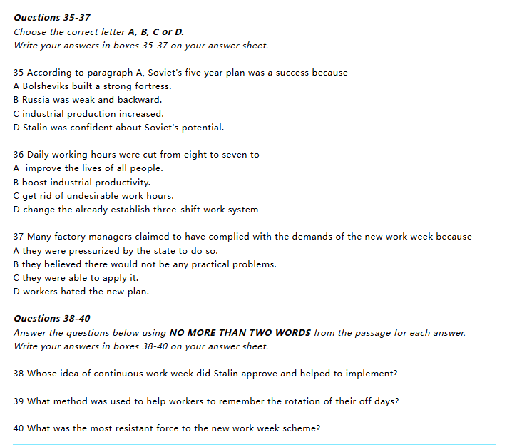 从文章内容来看,本文讲述了苏联在斯大林时期推行五天不间断工作制的历史,包括其推行背景、具体实施方案、失败原因及最终废除的整个过程。该文章收录于 9分达人阅读1 Test 2 Passage 3,不仅原文内容重复出现,本次考试中大多数题型和答案也均与以往保持一致。参考答案下面附原文,供各位考生参考。