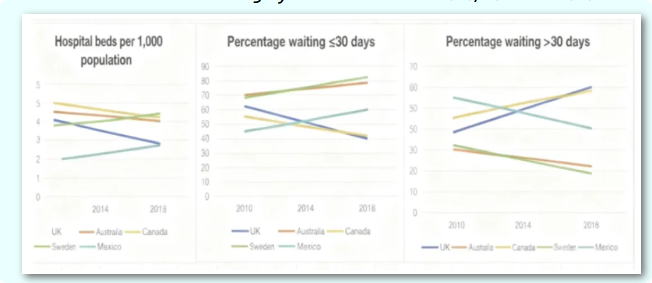 The line graphs below show the number of hospital beds per 1,000 people, and the percentage of patients who waited up to one month and those who waited more than one month for elective surgery in five countries in 2010, 2014 and 2018.