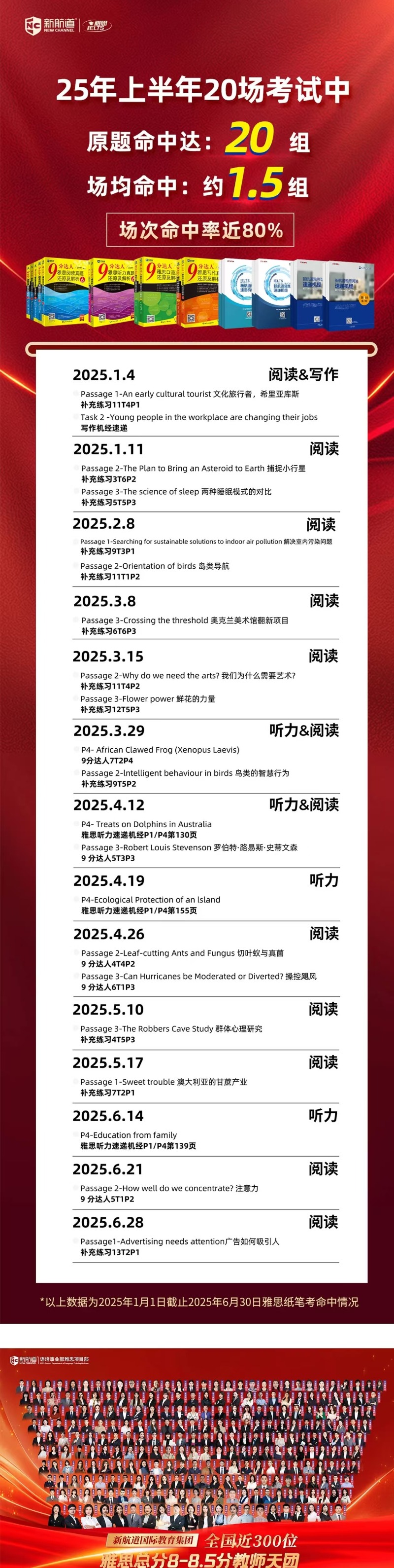值得特别关注的是,《9分达人》再次命中了原题!本场考试Passage 3 来自于《9分达人1》收录的文章,不仅文章内容重复考查,大多数题目和答案也保持一致。建议考生在备考过程中重视对《9分达人》系列教材的参考与练习。